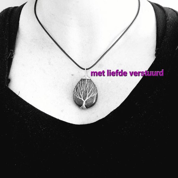 Edelsteen met leren ketting Lapis Lazuli druppel met levensboom (grote variant)
